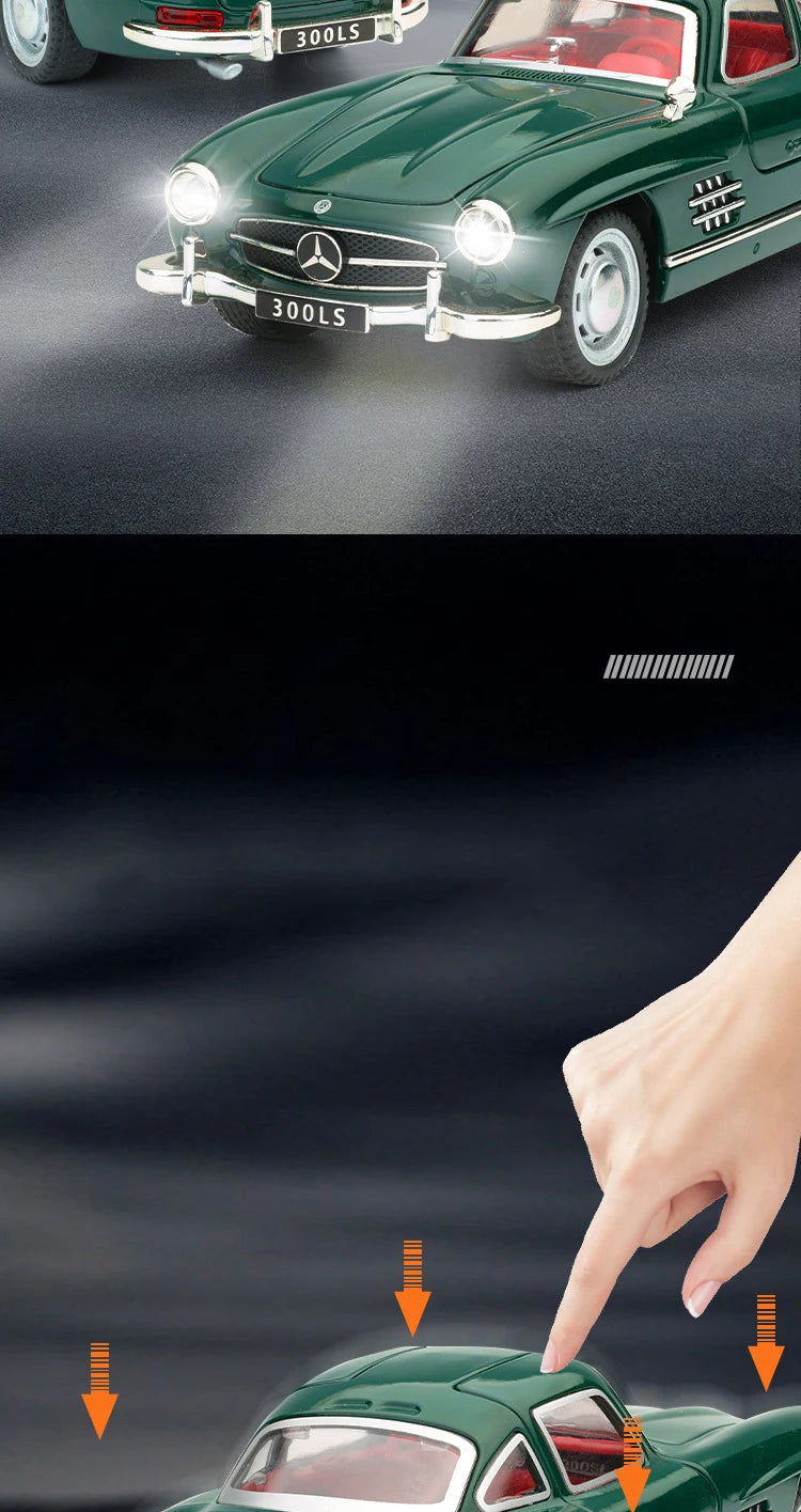Meticulously crafted replica of the legendary Mercedes-Benz 300SL Gullwing. Die-cast metal body with working LED lights and engine sounds. Pull-back motor for display dynamics. Opening gullwing doors showcase the detailed cockpit. 1:32 scale. An automotive icon captured in miniature form. Perfect for classic car collectors.